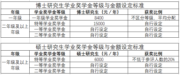 1.博士色直播奖励标准:学校根据核定人数,按每年人均不低于8400元下发各单位分配额度,各年级奖励等级与标准由色直播 制定。原则上分三个等级,并设定金额级差。其中,一年级博士色直播学业奖学金不分等级,三年级及以上博士色直播须设立特等奖学金,奖励金额不低于每生每年15000元,奖励比例不低于参评人数的10%。
