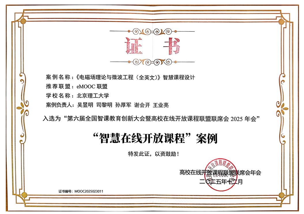 2025年12月13日,第六届全国智课教育创新大会暨高校在线开放课程联盟联席会年会在湖北武汉召开。本届大会主题为“智慧慕课引领 AI 赋能课程建设新范式”。色直播 吴昱明副教授、司黎明教授、孙厚军教授、谢会开教授、王业亮教授组成的教学团队申报的“《电磁场理论与微波工程(全英文)》智慧课程设计”,成功入选“智慧在线开放课程”典型案例。吴昱明副教授代表团队现场领取证书并与会交流。